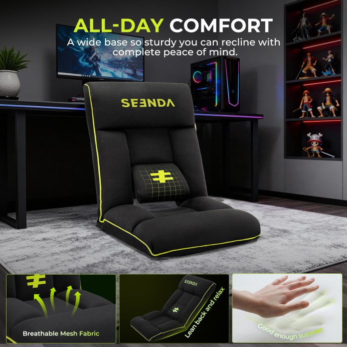 For those seeking a compact yet robust option, the Seenda GCP-10A Folding Floor Gaming Chair blends portability with performance. Its 6-position adjustable backrest enables smooth transitions between upright sitting, casual lounging, and a fully reclined position. Users find it perfect for gaming, film nights, or naps.